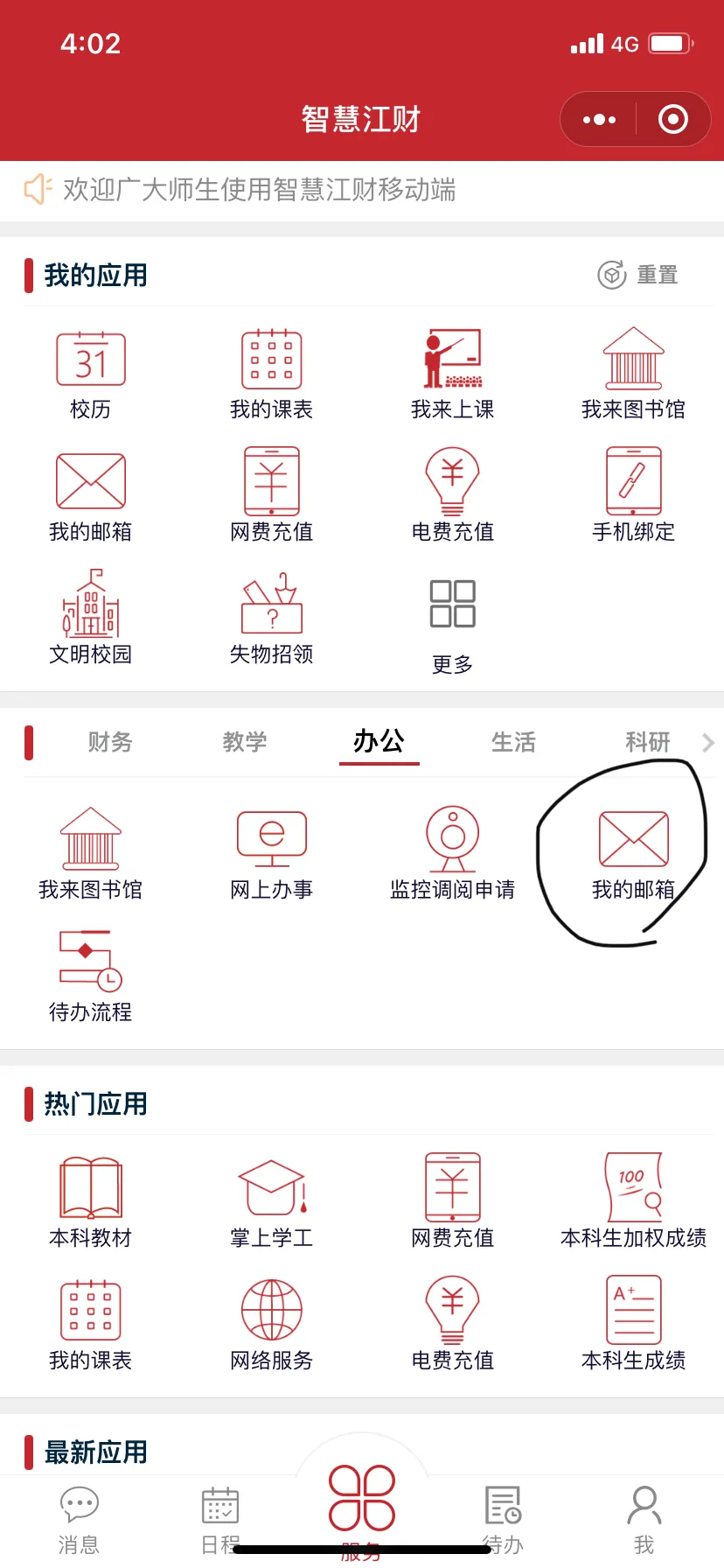打开智慧江财小程序,选择“办公-我的邮箱”在打开的页面中将自己的邮箱与密码记录下来。