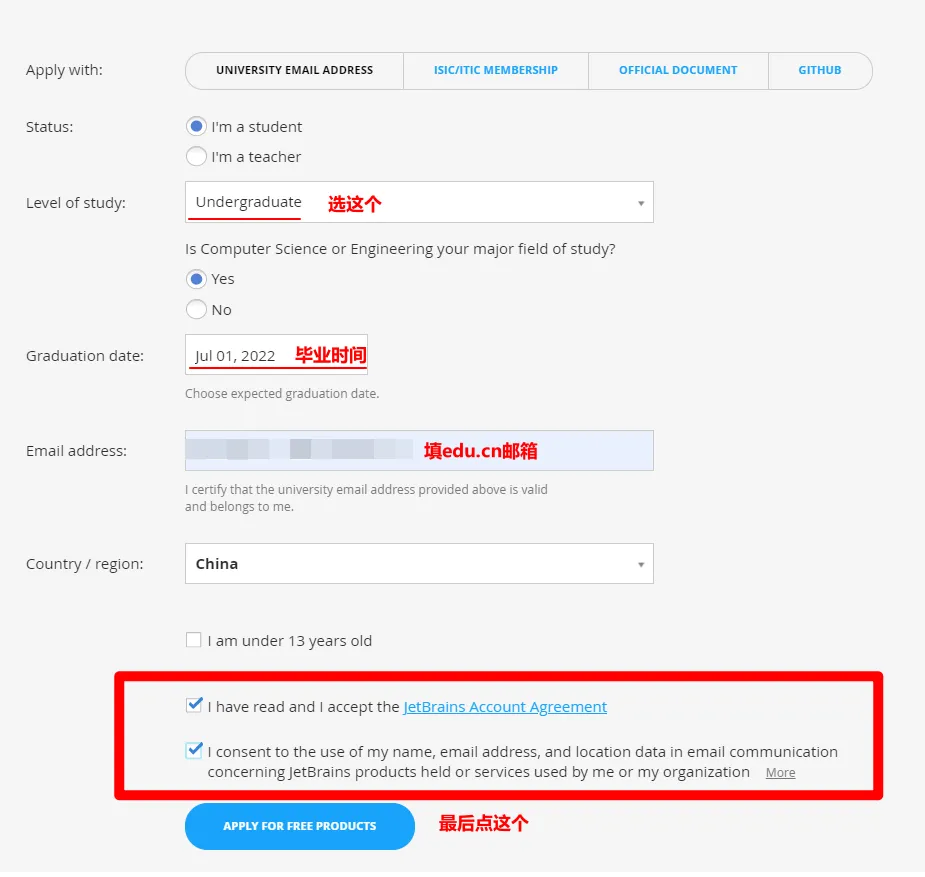 打开JetBrains官网学生优惠申请入口,按下图填写,姓名填真实姓名。