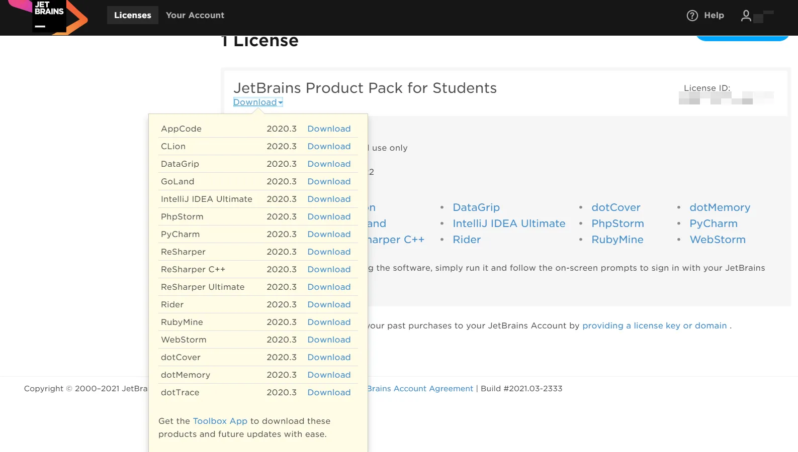 激活成功后进入账号页,登陆账户,即可在自己的Students' Pack中,下载你需要的tool,如果你要使用多个tool,建议下载Toolbox App进行统一管理,即下图download最下方Get the Toolbox App to download...